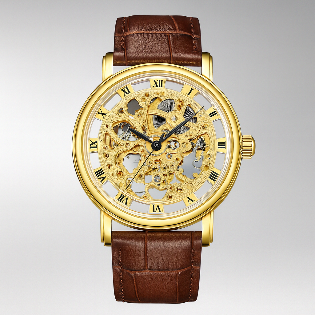 The Aurora M.1431 captures the romance of traditional watchmaking with a golden openwork dial framed by Roman numerals. Its hand-wind movement lets you feel the connection to every second, while the slim stainless steel case and genuine leather strap offer effortless comfort. Designed for those who appreciate heritage and craftsmanship, the Aurora brings a classic touch to any occasion.